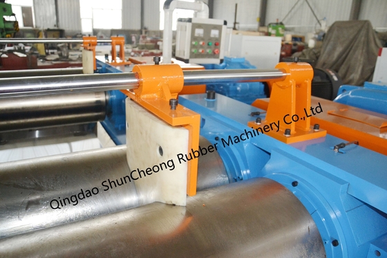 to adjust the temperature of the rollers. The two rollers rotate relative to each other at different speeds, pulling the rubber